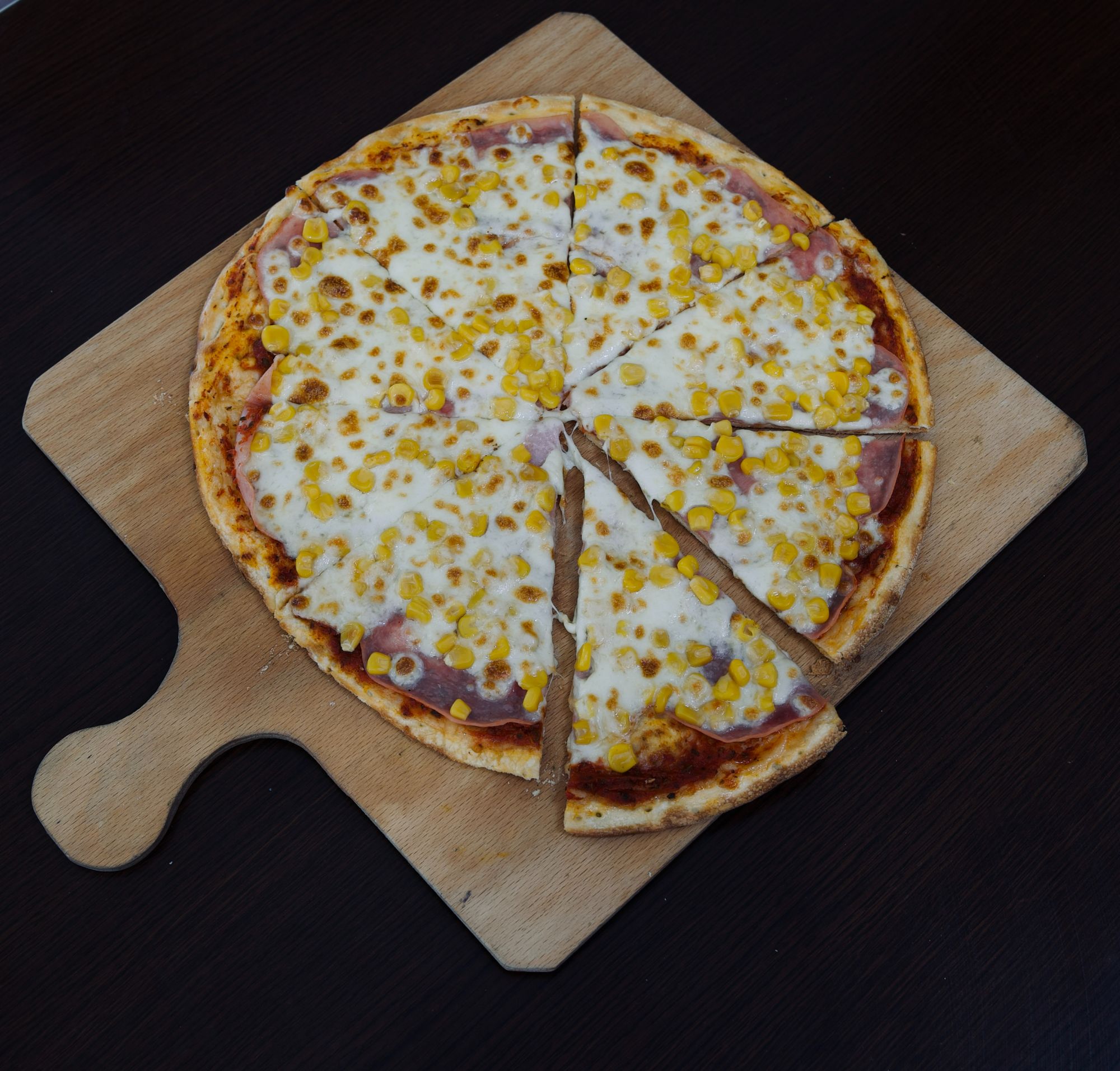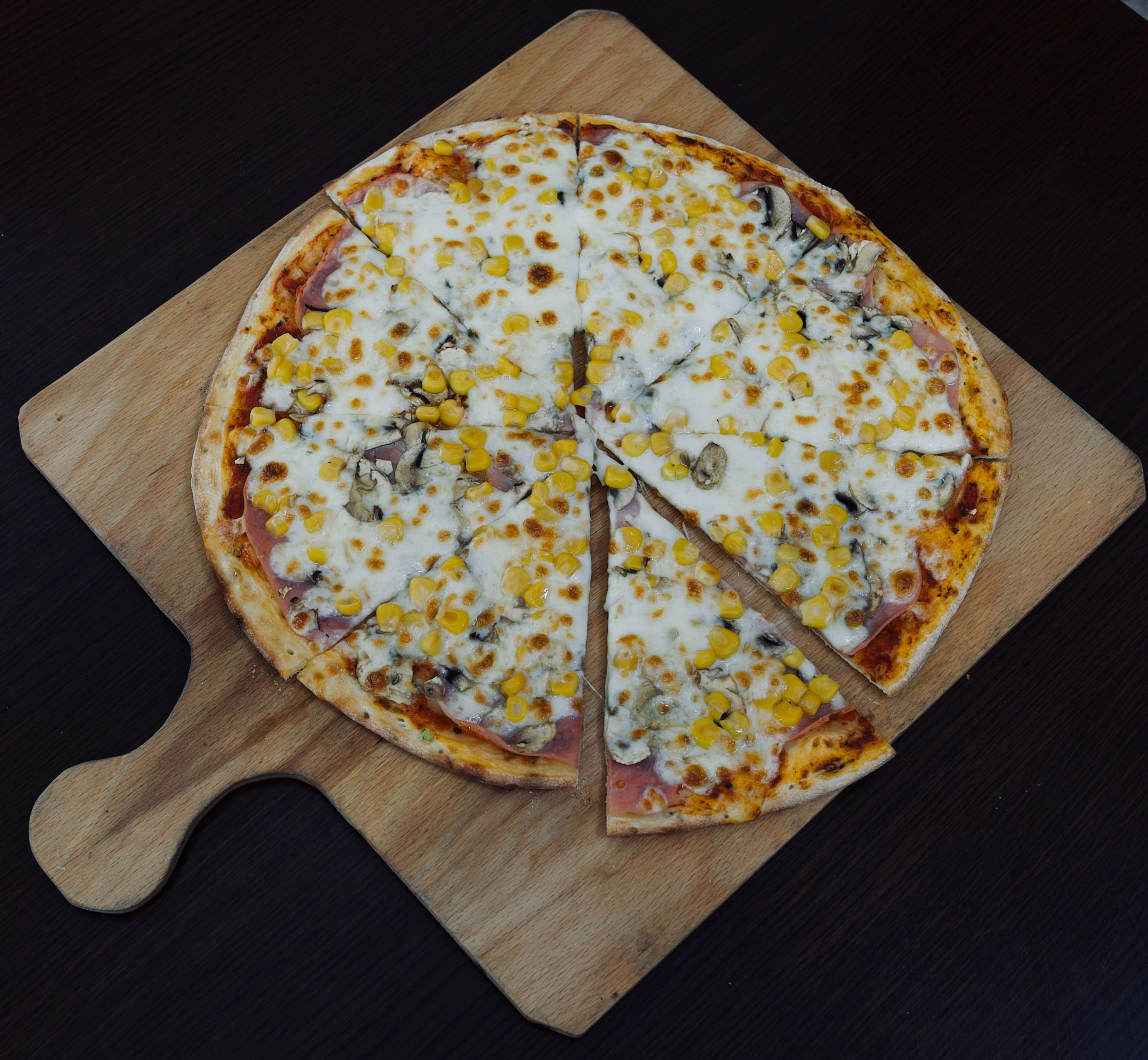 550g, tomato, mozzarella, šunka, šampiňóny, kukurica -