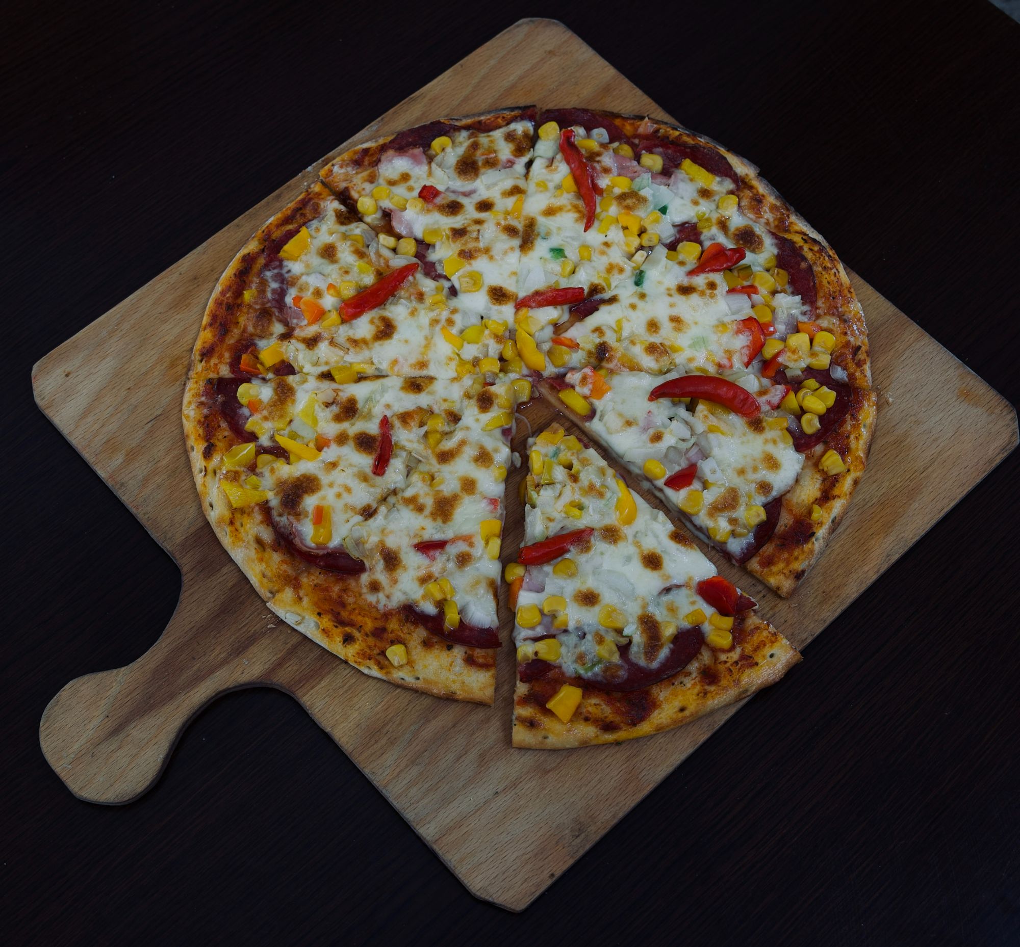 550g, tomato, mozzarella, saláma, slanina, paprika, feferóny, cibuľa, kukurica -