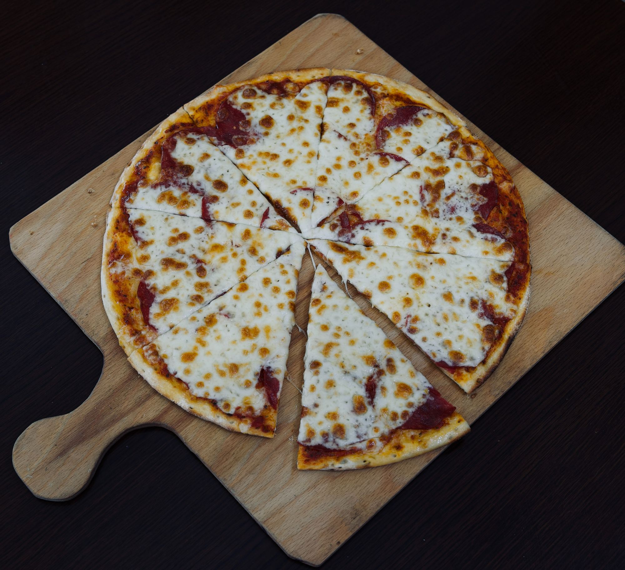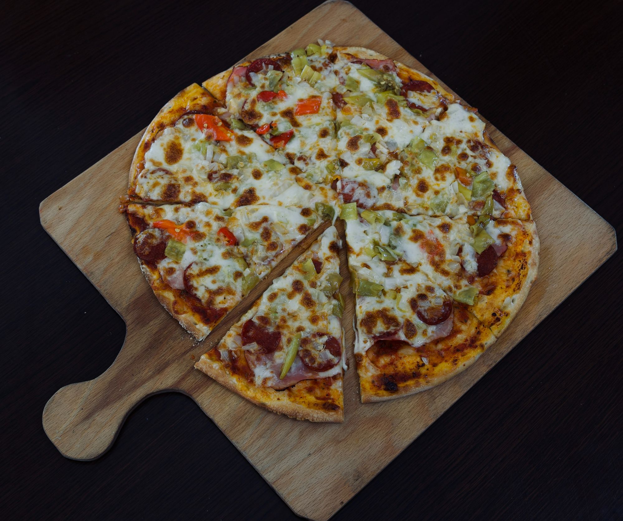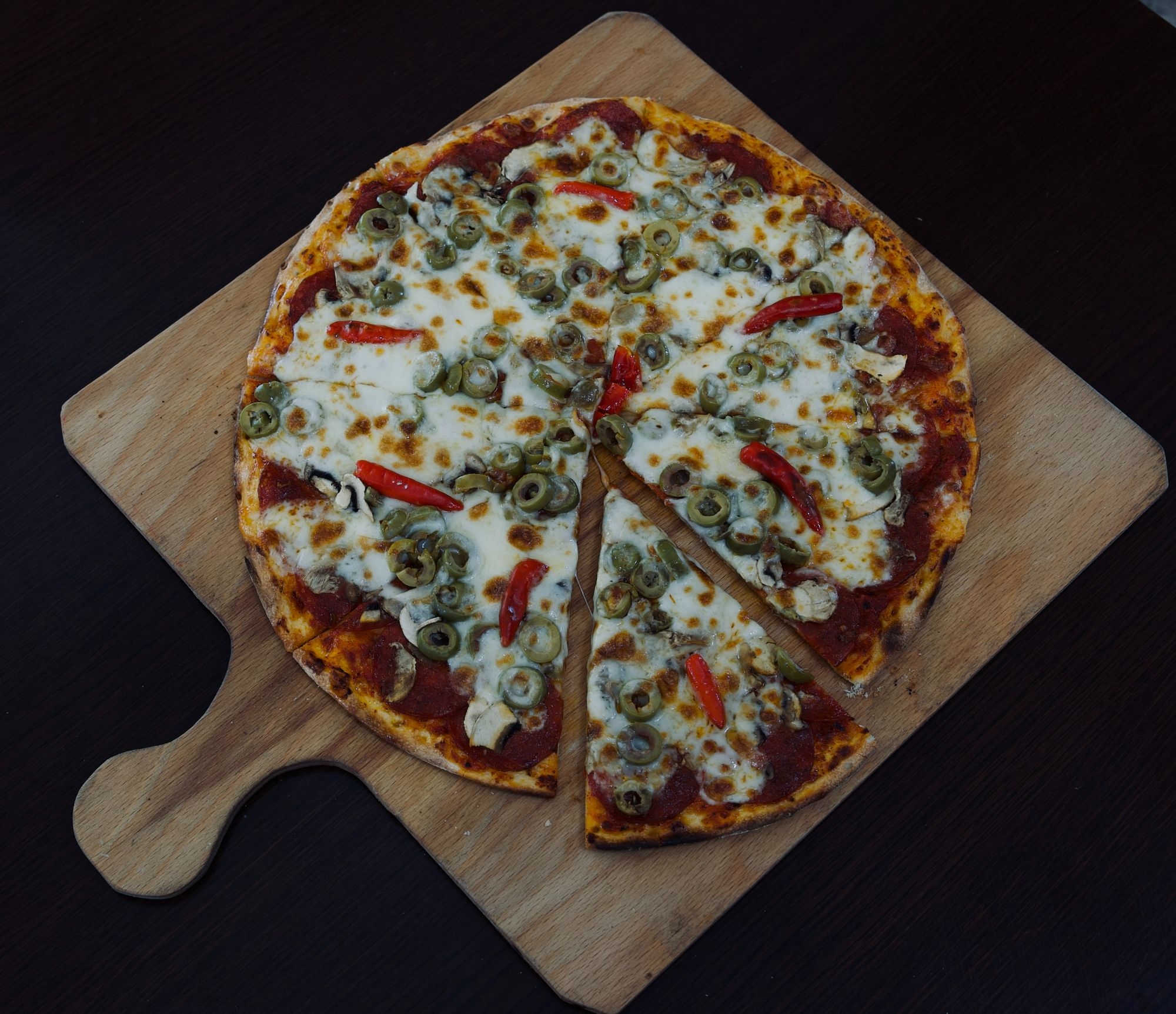 550g, tomato, mozzarella, pikantná saláma, šampiňóny, feferóny, olivy -