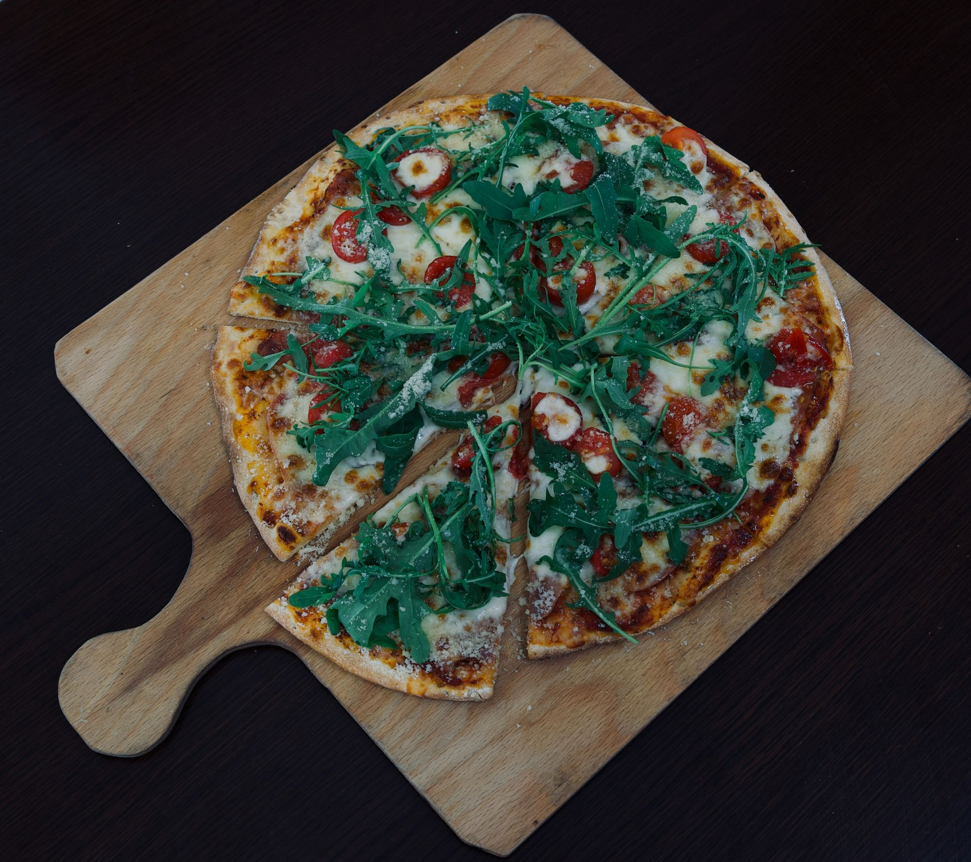 550g, tomato, mozzarella, prosciutto, rukola, cherry paradajky, parmezán