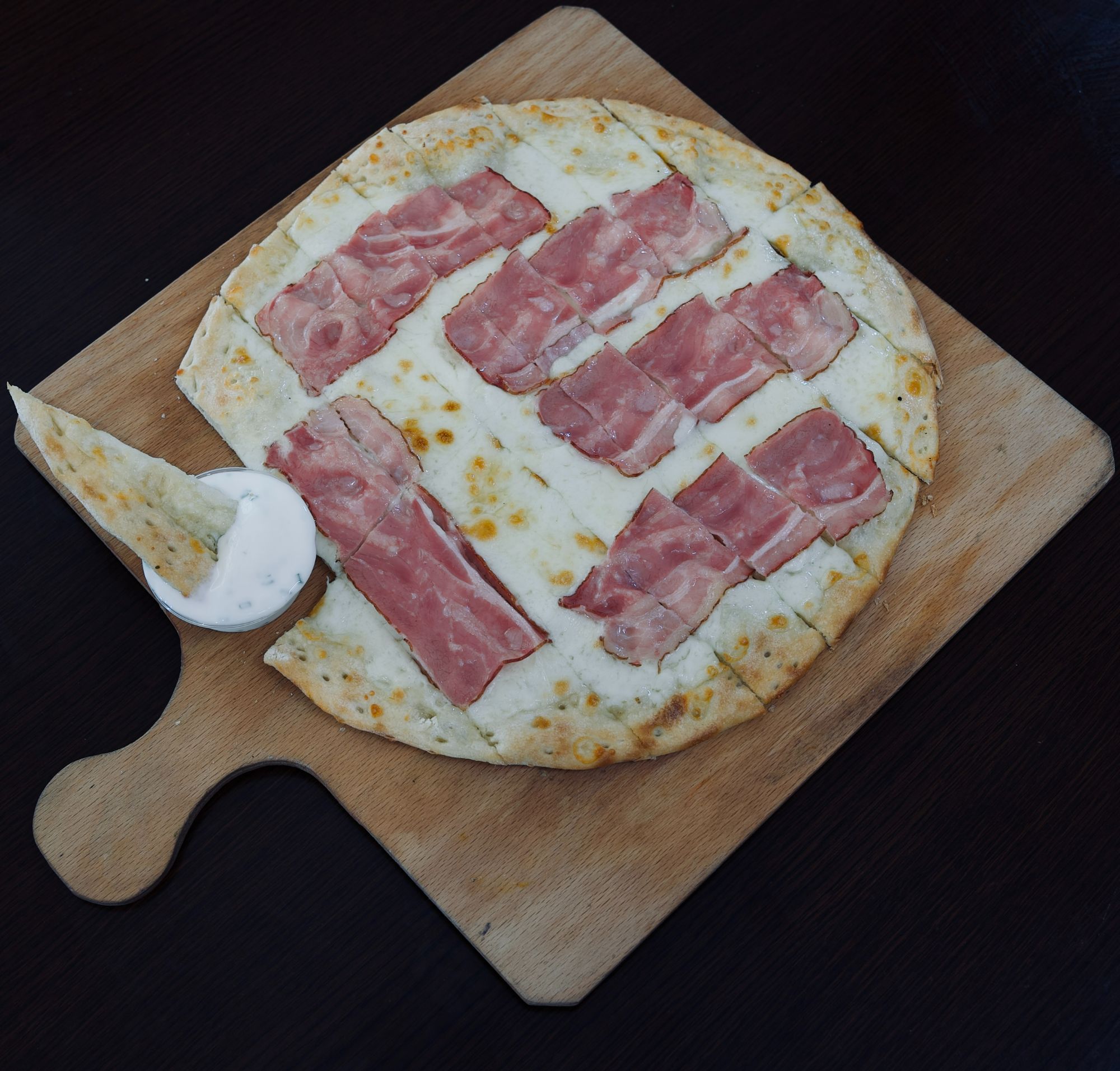 550g, smotanový základ, mozzarella, slanina, údený syr, bryndza, cibuľa